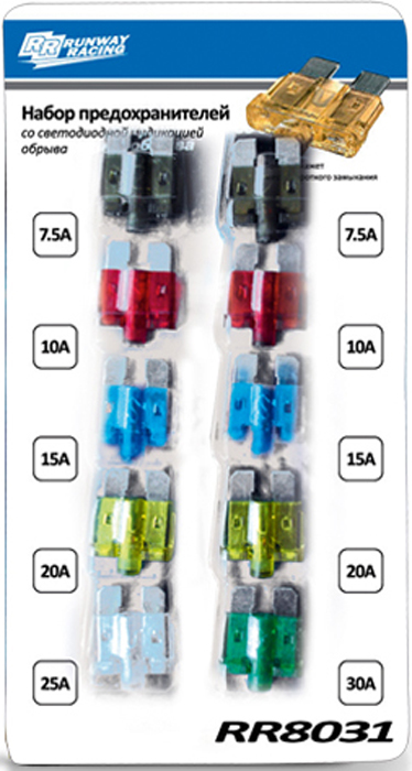 Плоские штекерные предохранители "Runway Racing" предназначены для защиты автомобильной электросети от короткого замыкания. В корпусе предохранителя встроен световой индикатор, который загорается при коротком замыкании или значительном превышении номинальной нагрузки, предохранитель при этом перегорает. Зачастую невозможно быстро определить, какой предохранитель перегорел. Используя светодиодные предохранители, Вам больше не придется возиться в гараже с фонариком и тратить свое время и силы на поиски перегоревшего предохранителя. Светодиодный элемент имеет пренебрежимо малую мощность и не нагревается при свечении, но его свет хорошо заметен и в дневное, и в ночное время суток.<br> Не зависимо от полярности световая индикация будет показывать обрыв цепи.<br> Сила тока: 7.5А– 2шт., 10А – 2шт., 15А - 2шт., 20А – 2шт., 25А, 30А