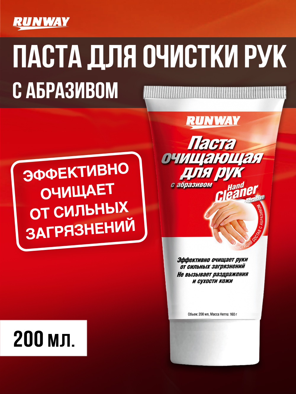 Паста очищающая для рук с абразивом Runway - универсальное средство, предназначенное для эффективной очистки рук от сильных загрязнений: нефтепродуктов, масел, смазок, жиров, грязи. Состав эффективно и бережно удаляет все технические загрязнения с кожи аосле ремонта автомобиля, велосипеда или дачного строительства. Содержит смягчающие кожу рук добавки. Не вызывает раздражения и сухости кожи.