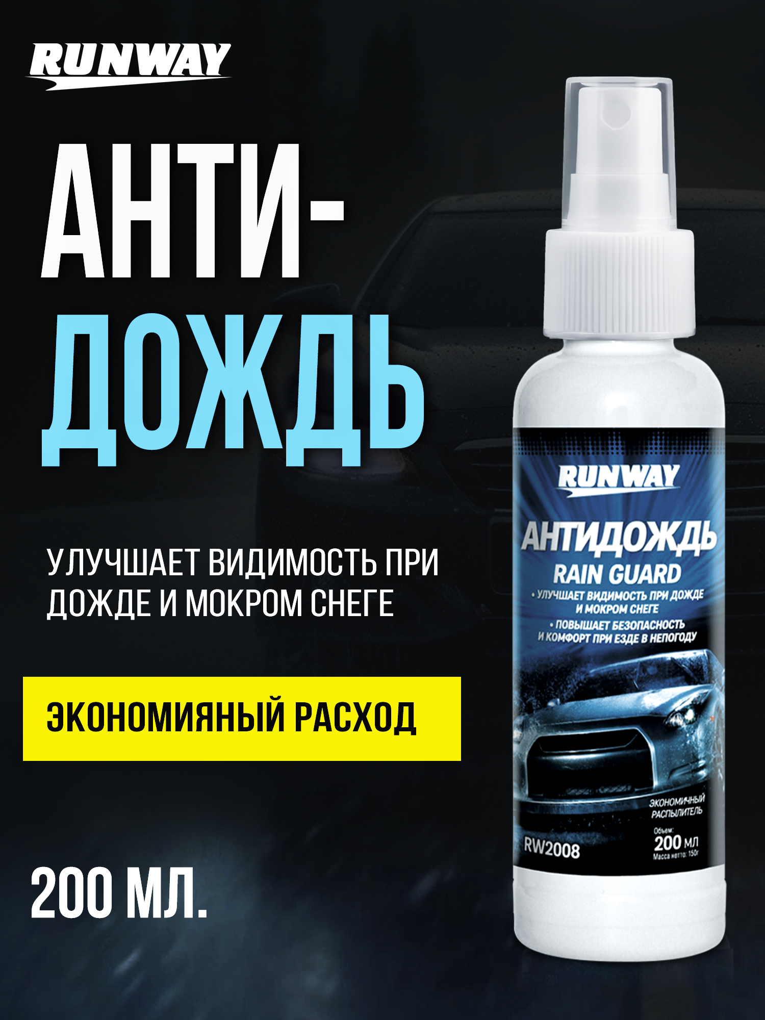 Антидождь "Runway" создает на поверхности прозрачное, суперскользкое полимерное покрытие, что позволяет не использовать стеклоочистители во время движения при дожде или мокром снеге. Улучшает видимость, повышает безопасность и комфорт при езде в непогоду. Очищает и предохраняет стекла от загрязнения и обледенения. Предназначен для наружной обработки зеркал, фар и стекол автомобилей, мотоциклов, моторных лодок и катеров.