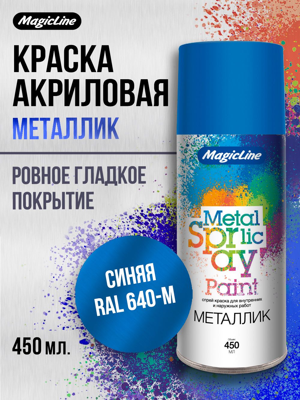 Аэрозольная краска металлик MagicLine изготовлена на основе современной синтетической смолы с добавлением металлического порошка. Обеспечивает образование особо прочного покрытия с эффектом металлик. Универсальная аэрозольная краска металлик в баллончике предназначена для окраски металлических, деревянных, стеклянных и других поверхностей, подвергающихся атмосферным воздействиям. Краска Хром и Золото MagicLine применяется для создания эффекта гальванизирования и особо устойчива к воздействию ультрафиолетового излучения.