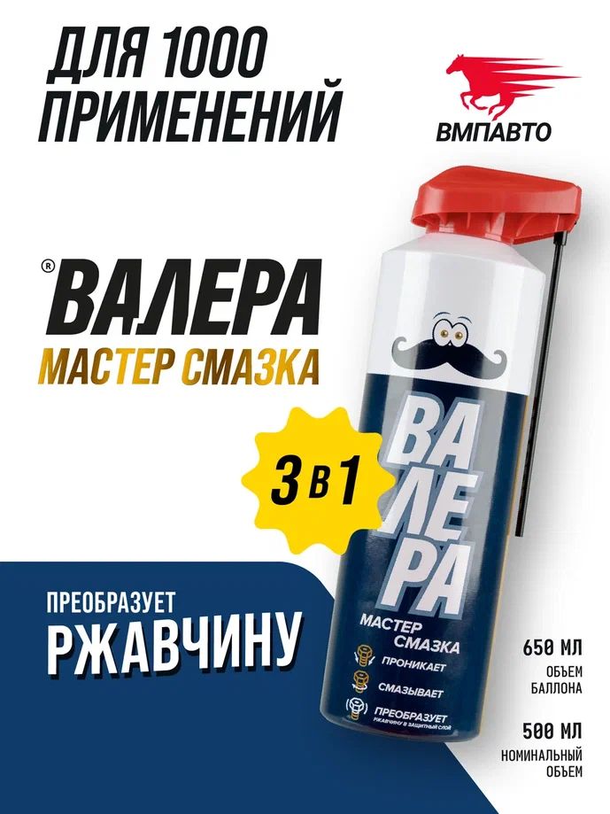 Валера – это профессиональная проникающая синтетическая силиконовая смазка, которая не только преобразует ржавчину в защитный слой, но и превосходит аналоги (включая WD 40) по долговечности и защитным свойствам.