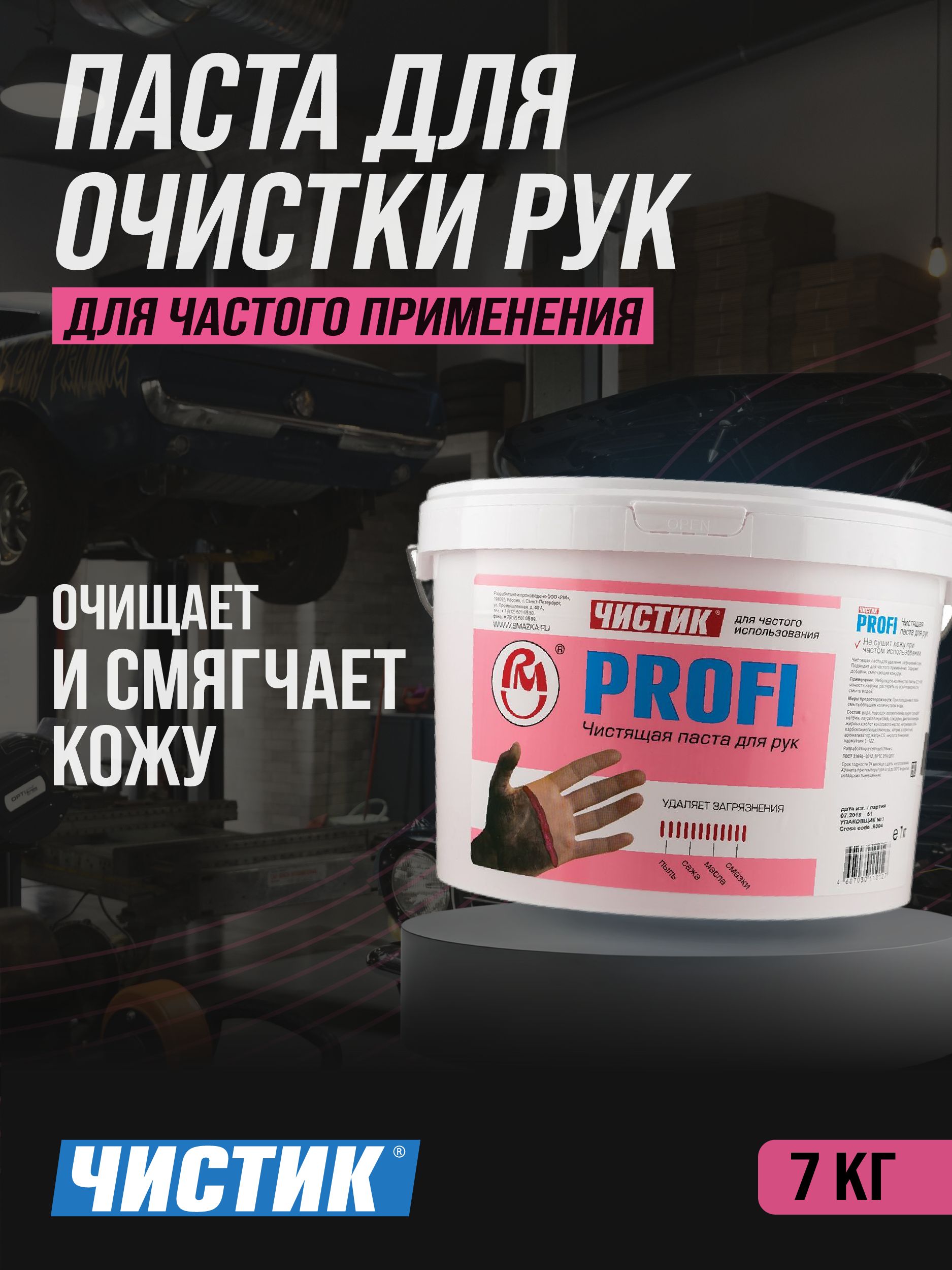 Средство для очистки рук от устойчивых загрязнений Чистик PROFI — идеально подходит для частого применения и профессионального использования. Чистящее средство содержит мягкий скраб и добавки смягчающие кожу. Паста имеет приятный запах. Не вызывает аллергических реакций. Хорошо чистит, не раздражает кожу рук. Пользуется авторитетом у мастеров автосервисов. Удаляет такие загрязнения как: смазки, масла, сажа, пыль. Чистик PROFI содержит активные моющие вещества, которые расщепляют сильные загрязнители, и выводят токсины из кожи. Благодаря мягкому скрабу, чистящая паста для рук отшелушивает остатки грязи, и очищает поры от вредных бактерий. Не содержит растворителей.
